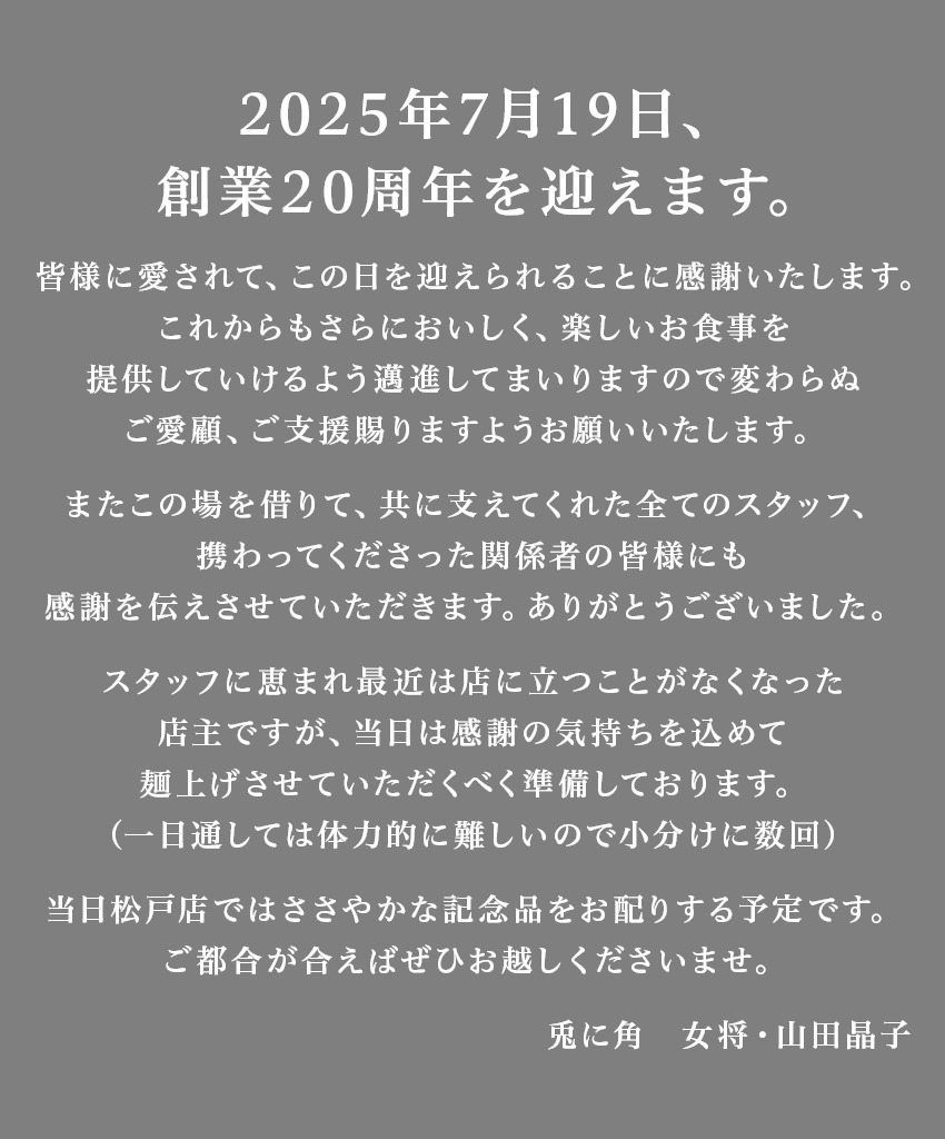 素材や製法の能書きを並べるよりも、まずは「兎に角(とにかく)」当店のラーメンを召し上がって頂きたい。